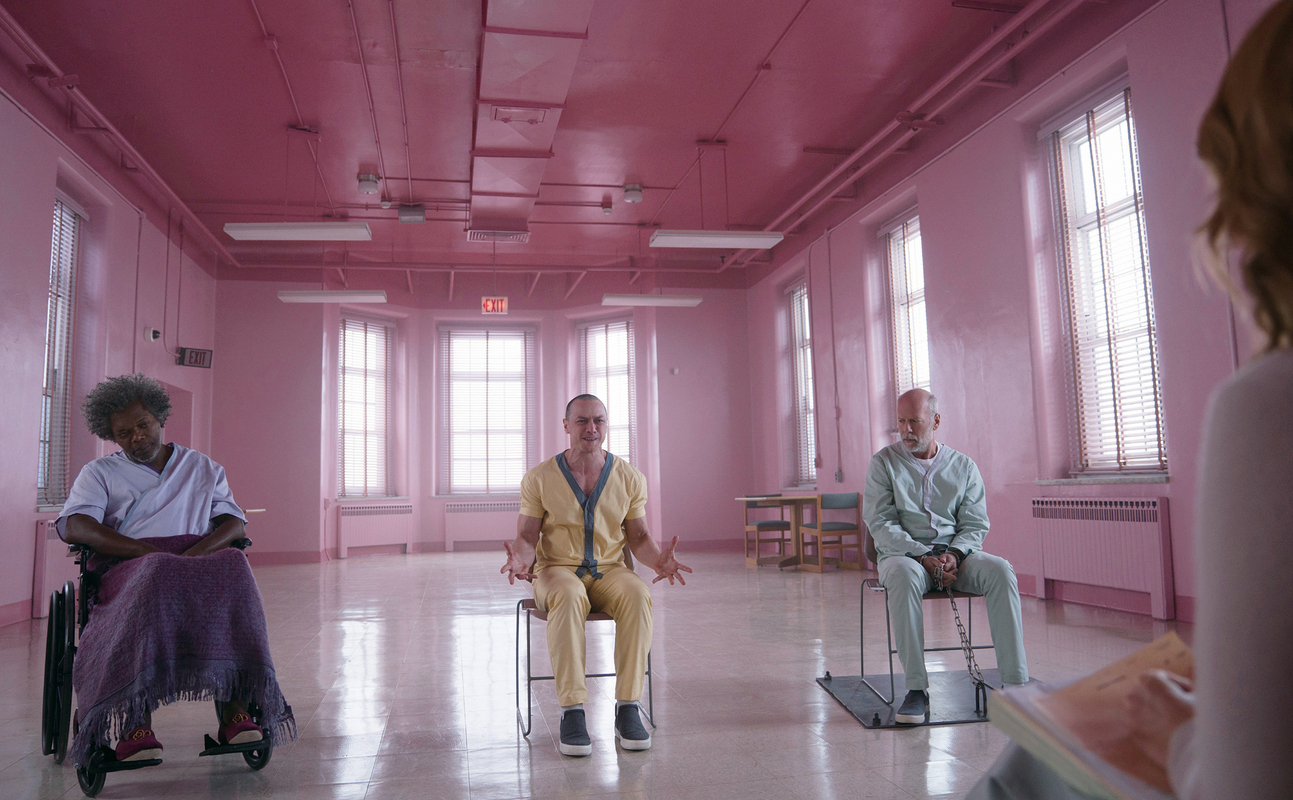 세 캐릭터는 자신에게 초능력이 있다고 믿는 망상을 하는 개인들의 치료를 전문으로 하는 정신과 의사인 엘리 스테이플 박사(사라 폴슨)에 의해 실험을 당하게 됩니다. 스테이플은 그들의 능력이 단지 망상일 뿐이며 실제로 슈퍼 히어로나 악당이 아니라고 확신시키려고 합니다. 그러나 트리오는 스테이플이 진실을 말하고 있는지 의문을 갖기 시작하고 그들 사이의 대결이 이어집니다. 이때부터 미스터 글래스의 활약이 시작됩니다.