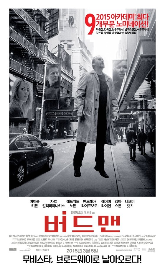 "버드맨"(Birdman)은 알레한드로 곤살레스 이냐리투 감독이 연출하고 마이클 키튼, 에드워드 노턴, 엠마 스톤, 잭 갈리퍼내키스가 주연으로 출연하는 2014년 영화입니다. 이 작품은 한때 슈퍼히어로 버드맨 역할로 유명했던 배우인 리건 톰슨(마이클 키튼)이 브로드웨이 연극을 공연함으로써 그의 경력을 되살리려는 이야기를 담고 있습니다.